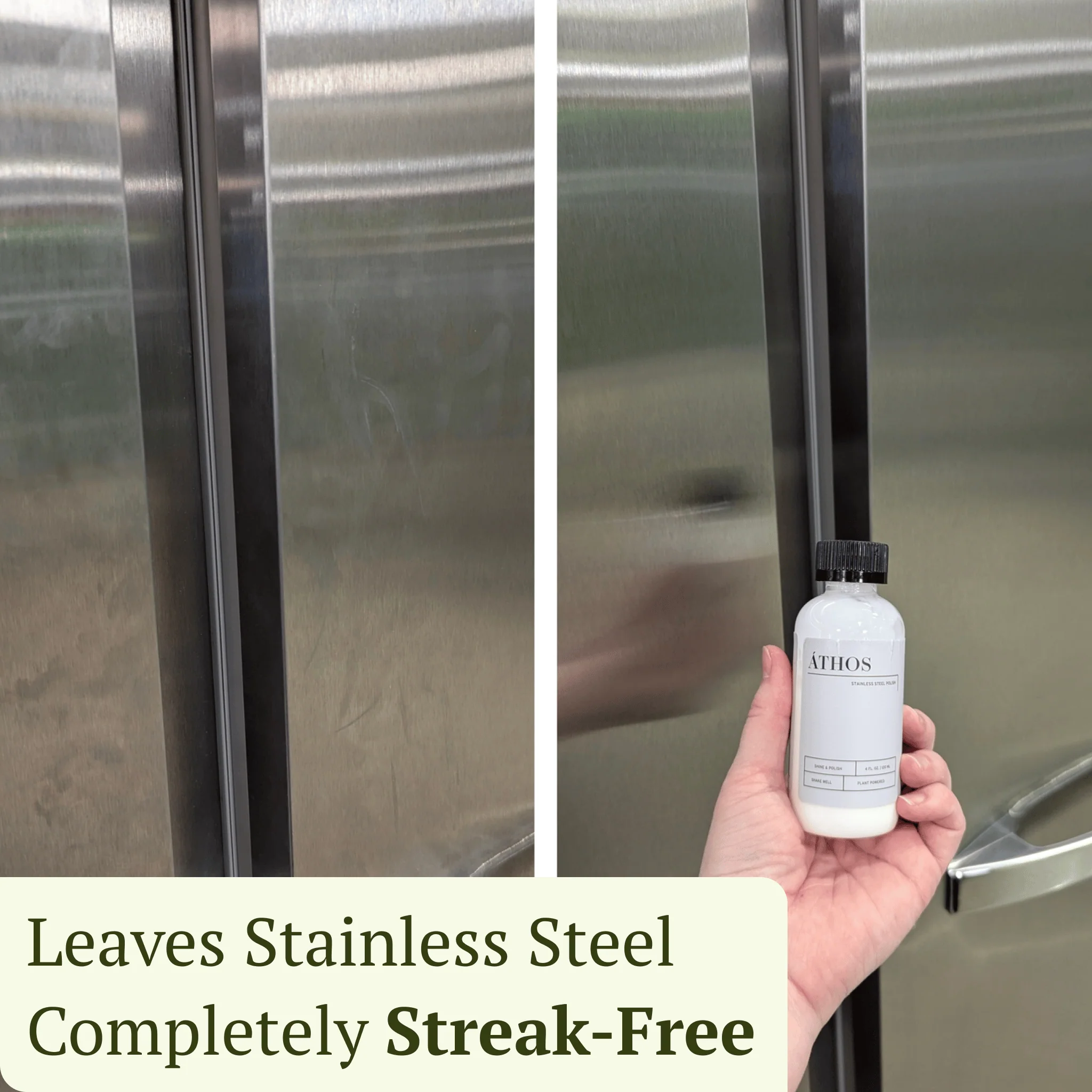 Shake well before using. Pour a small amount of ÁTHOS Stainless Cleaner onto a clean, dry towel. Using smooth, circular motions, apply evenly across the surface. For heavily soiled areas, pre-clean with ÁTHOS Multi-Surface Cleaner before applying. Use monthly or as needed to maintain a natural shine.